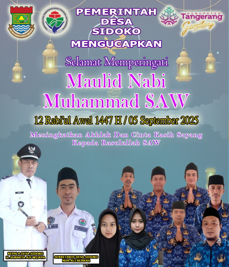 Sidoko, 05 September – Dalam rangka memperingati Maulid Nabi Muhammad SAW 1447 Hijriah, Pemerintah Desa Sidoko menyampaikan ucapan selamat kepada seluruh masyarakat desa dan umat Islam pada umumnya.